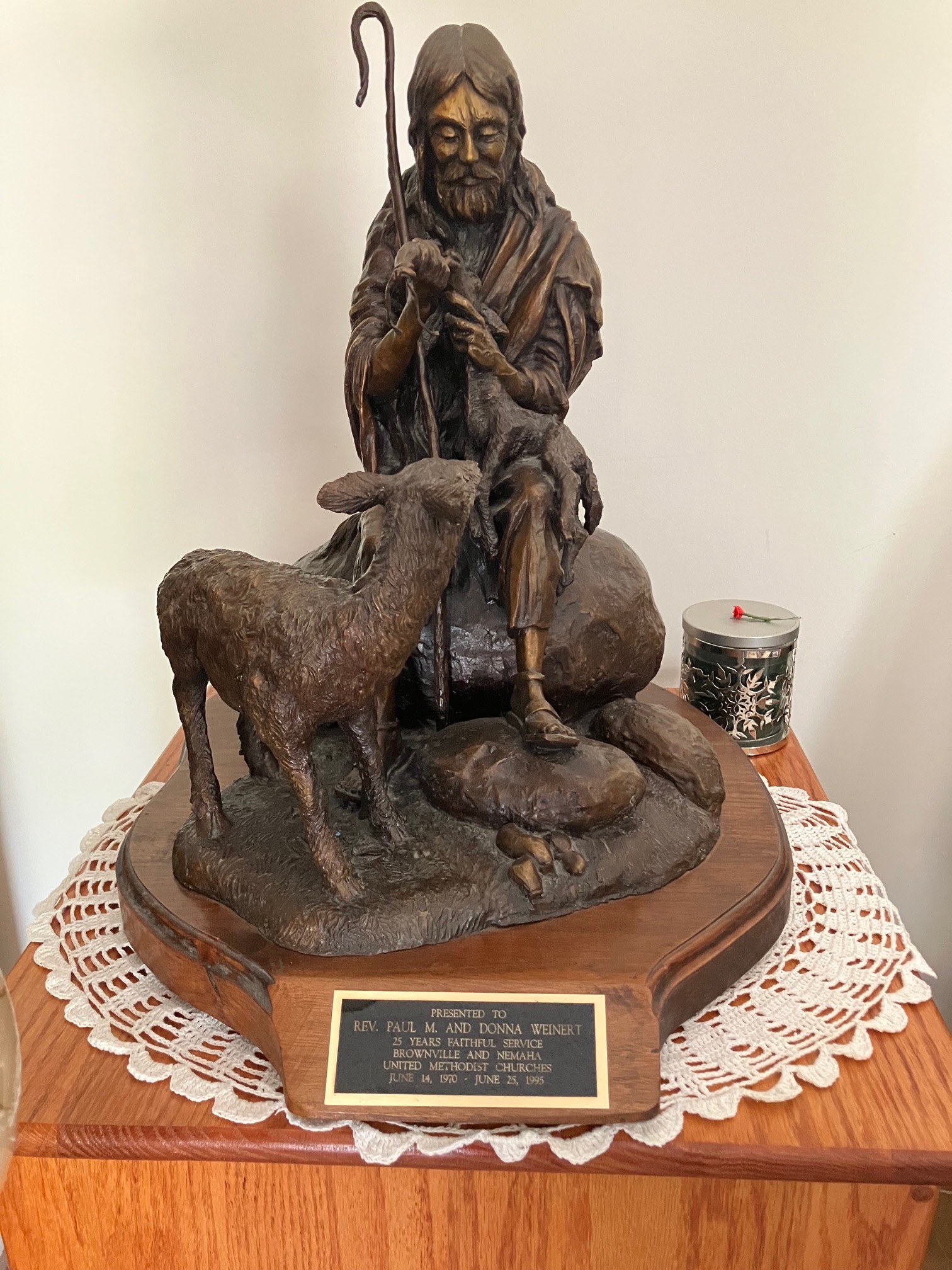 Palmerton Bronze Sculpture of The Good Shepherd was given to Rev. Paul & Donna Weinert in honor of his having served the Brownville & Nemaha, NE Methodist Churches for 25 years. It was donated to the Museum by their surviving family. ![]() |