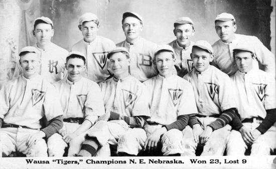 Wausa Baseball Team - 1910 Front: Cotton Gallager, Lidell, Farn Waters, Edgar Johnson, John Mauritz Olson, Freeman Johnson. Back: Harry Anderson, Rudy Gallager, unidentified, Hugo Carlson, Iver Carlson.
